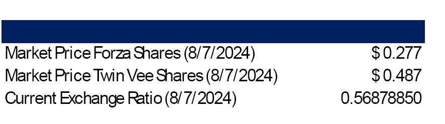 At the closing of the Merger, the holders of Forza Common Stock will receive 0.611666275 shares of Twin Vee Common Stock (the “Exchange Ratio”) in exchange for each share of Forza Common Stock that they own on the effective date of the Merger for a maximum of 5,355,000 shares of Twin Vee Common Stock (no fractional shares of Twin Vee Common Stock will be issued) and the 7,000,000 shares of Forza Common Stock held by Twin Vee will be cancelled. After the Merger, Twin Vee will have 14,875,000 shares of Twin Vee Common Stock outstanding. The Exchange Ratio was negotiated so that the pre-closing stockholders of each of Twin Vee and Forza would beneficially own approximately 64% and 36%, respectively of the outstanding shares of Twin Vee Common Stock following the closing of the Merger and not counting for purposes of the computation any outstanding options to purchase shares of Forza Common Stock or any outstanding warrants to purchase shares of Forza Common Stock. Accordingly, at the closing of the Merger: (i) each outstanding share of Forza Common Stock (other than shares held by Twin Vee) will be converted into 0.611666275 of a share of Twin Vee Common Stock, (ii) each outstanding stock option exercisable for shares of Forza Common Stock that is outstanding at the effective time of the Merger (the “Effective Time”), whether vested or unvested, will be assumed by Twin Vee and converted into a stock option to purchase the number of shares of Twin Vee Common Stock that the holder would have received if such holder had exercised such stock option to purchase shares of Forza Common Stock prior to the Merger and exchanged such shares for shares of Twin Vee Common Stock in accordance with the Exchange Ratio, (iii) each outstanding warrant to purchase shares of Forza Common Stock will be assumed by Twin Vee and converted into a warrant to purchase the number of shares of Twin Vee Common Stock that the holder would have received if such holder had exercised such warrant to purchase shares of Forza Common Stock prior to the Merger and exchanged such shares for shares of Twin Vee Common Stock in accordance with the Exchange Ratio, and (iv) the 7,000,000 shares of Forza Common Stock held by Twin Vee will be cancelled. For a more complete description of the Exchange Ratio, see the section titled “The Merger Agreement—Exchange Ratio” in this Joint Proxy Statement/Prospectus.