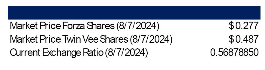 Subject to the terms and conditions of the Merger Agreement, if the Merger is completed, at the Effective Time (i) each outstanding share of Forza Common Stock (other than shares held by Twin Vee) will be converted into the right to receive 0.611666275 shares of Twin Vee Common Stock (the “Exchange Ratio”), (ii) each outstanding stock option exercisable for shares of Forza Common Stock that is outstanding at the Effective Time, whether vested or unvested, will be assumed by Twin Vee and converted into a stock option to purchase the number of shares of Twin Vee Common Stock that the holder would have received if such holder had exercised such stock option for shares of Forza Common Stock prior to the Merger and exchanged such shares for Twin Vee Common Stock in accordance with the Exchange Ratio, (iii) each outstanding warrant to purchase shares of Forza Common Stock will be assumed by Twin Vee and converted into a warrant to purchase the number of shares of Twin Vee Common Stock that the holder would have received if such holder had exercised such warrant for shares of Forza Common Stock prior to the Merger and exchanged such shares for Twin Vee Common Stock in accordance with the Exchange Ratio, subject to adjustment for any reverse stock split, and (iv) the 7,000,000 shares of Forza Common Stock held by Twin Vee will be cancelled.