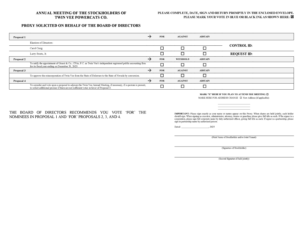 You are cordially invited to attend the 2025 Annual Meeting of Stockholders (the “2025 Annual Meeting”) of Twin Vee PowerCats Co., a Delaware corporation (“Twin Vee” or the “Company”). The meeting will be held on Thursday, December 4, 2025 at 10:00 a.m. Eastern Time at the offices of Twin Vee, 3101 S US Hwy 1, Fort Pierce, Florida 34982, for the following purposes: